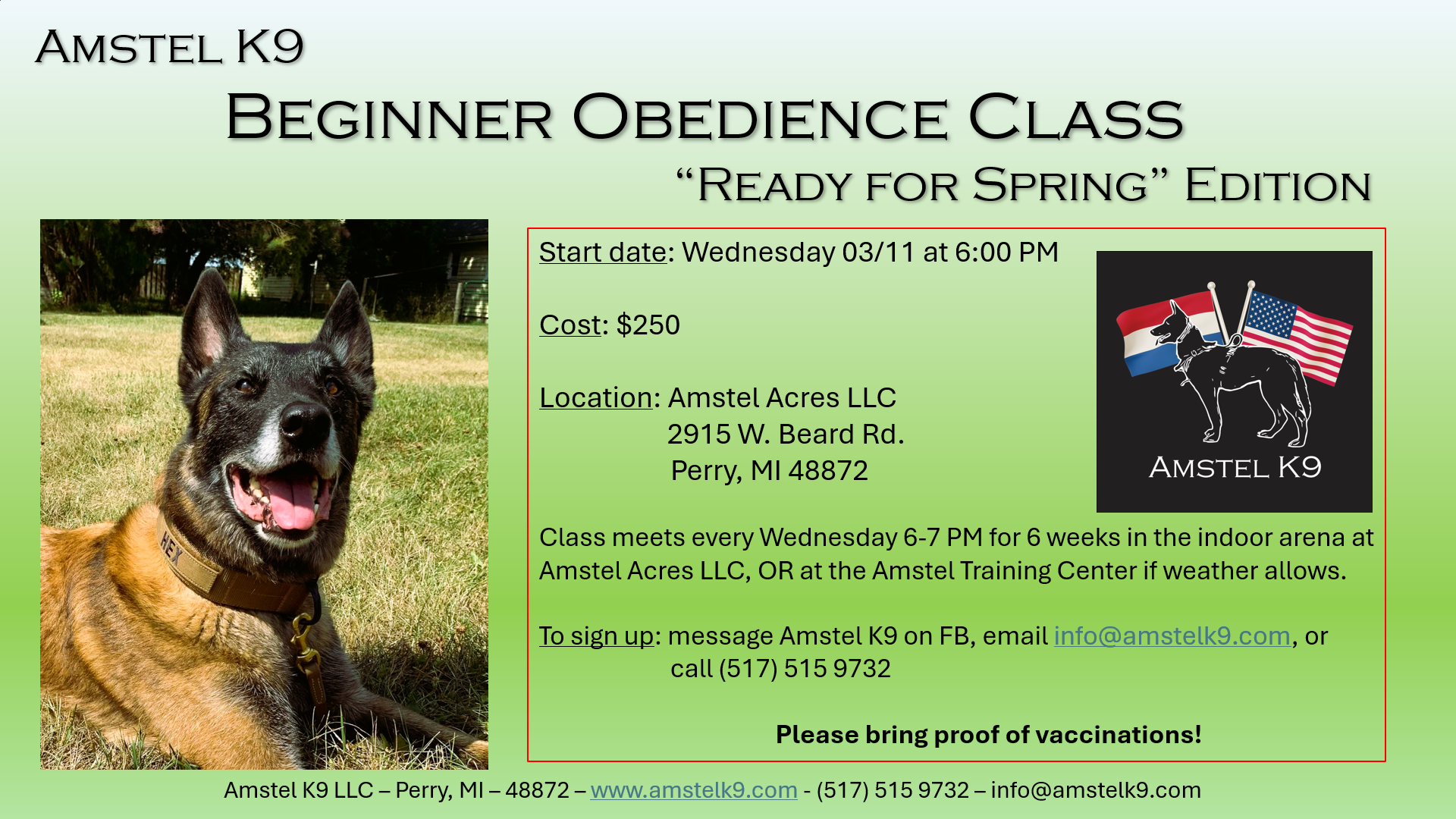 A new round of beginner group obedience class will be starting Wednesday 03/11/2026! This class will run for six weeks, cost $250.- for the class. Contact us at info@amstelk9.com with questions.